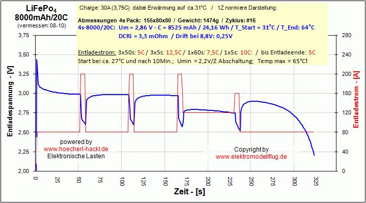 Die Kapazität war also bei dieser enorm hohen Stromabnahme sogar noch höher als die 8Ah Nennkapazität.
