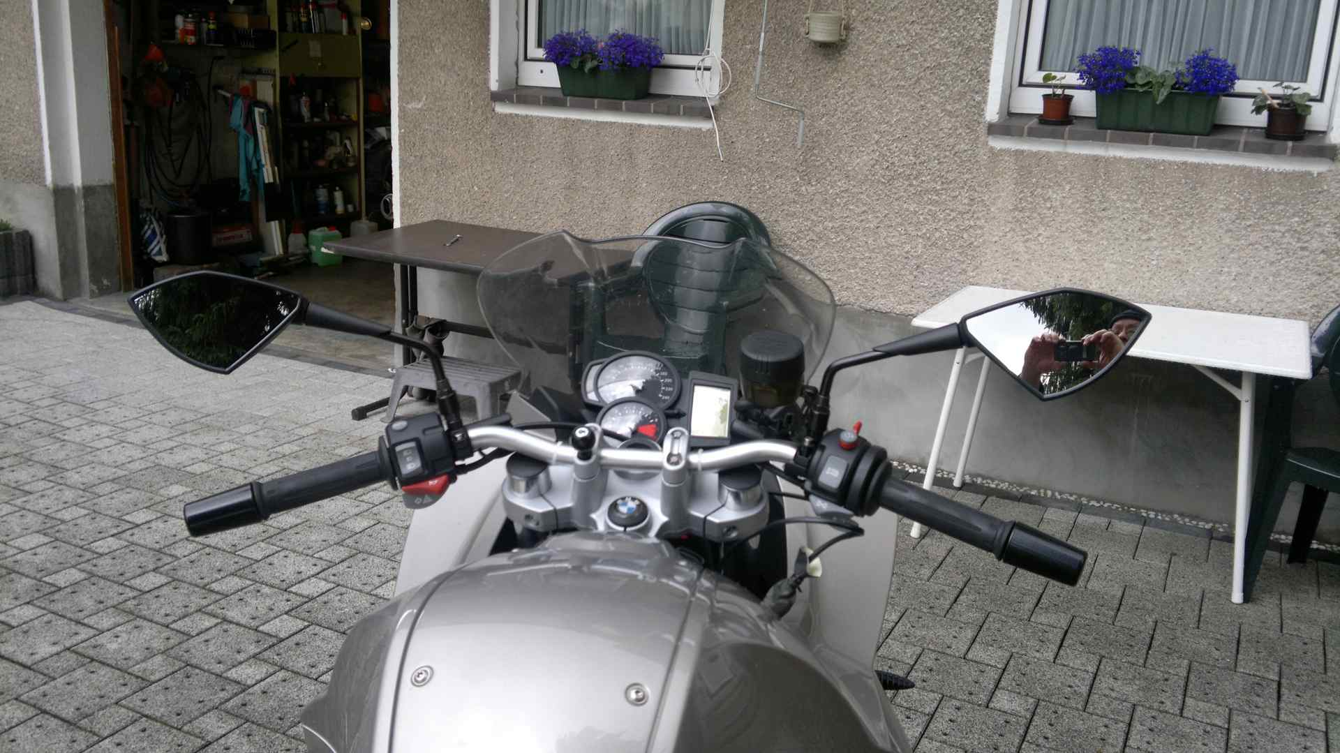 Ich habe mich für die Variante Lenkerspiegel entschieden. Du besorgst Dir die obere Spiegelaufnahme der 800R (http://www.realoem.com/bmw/showparts.do?model=0217&mospid=51599&btnr=32_1767&hg=32&fg=72&hl=2 Bild 7)für Kupplung und Gas. Die passen exakt. Dann aus dem Zubehör passende Spiegel aussuchen. Darauf achten, dass man für Zubehörspiegel meist einen BMW Adapter braucht. Spiegel haben meist eine "Gewindesteigung" von 1,5. BMW hat eine von 1,25 (z.B. sowas:http://www.louis.de/_207a9d3b513ecac860803c1fbf50233ddc/index.php?topic=artnr&artnr=10028904