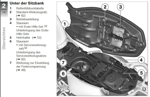 meinst Du den rudimentären "Werkzeugsatz" :lol: bestehend aus einem umsteckbaren Schlitz-Torx Schraubendreher (s. Bild die Nr. 2)? Ich hatte noch einen mit einem Kabelbinder befestigten 17er Maulschlüssel (einseitig), den ich nie gebraucht hatte, unter der Sitzbank.