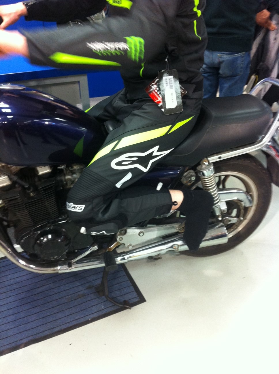 Die Hose ist zu kurz. Richtig ist ja schon mal, dass Du die Anprobe im Sitzen auf einer Maschine machst. Solltest Du keine "lange Sondergröße" finden, bleibt wohl nur noch der Weg zum Lederschneider.