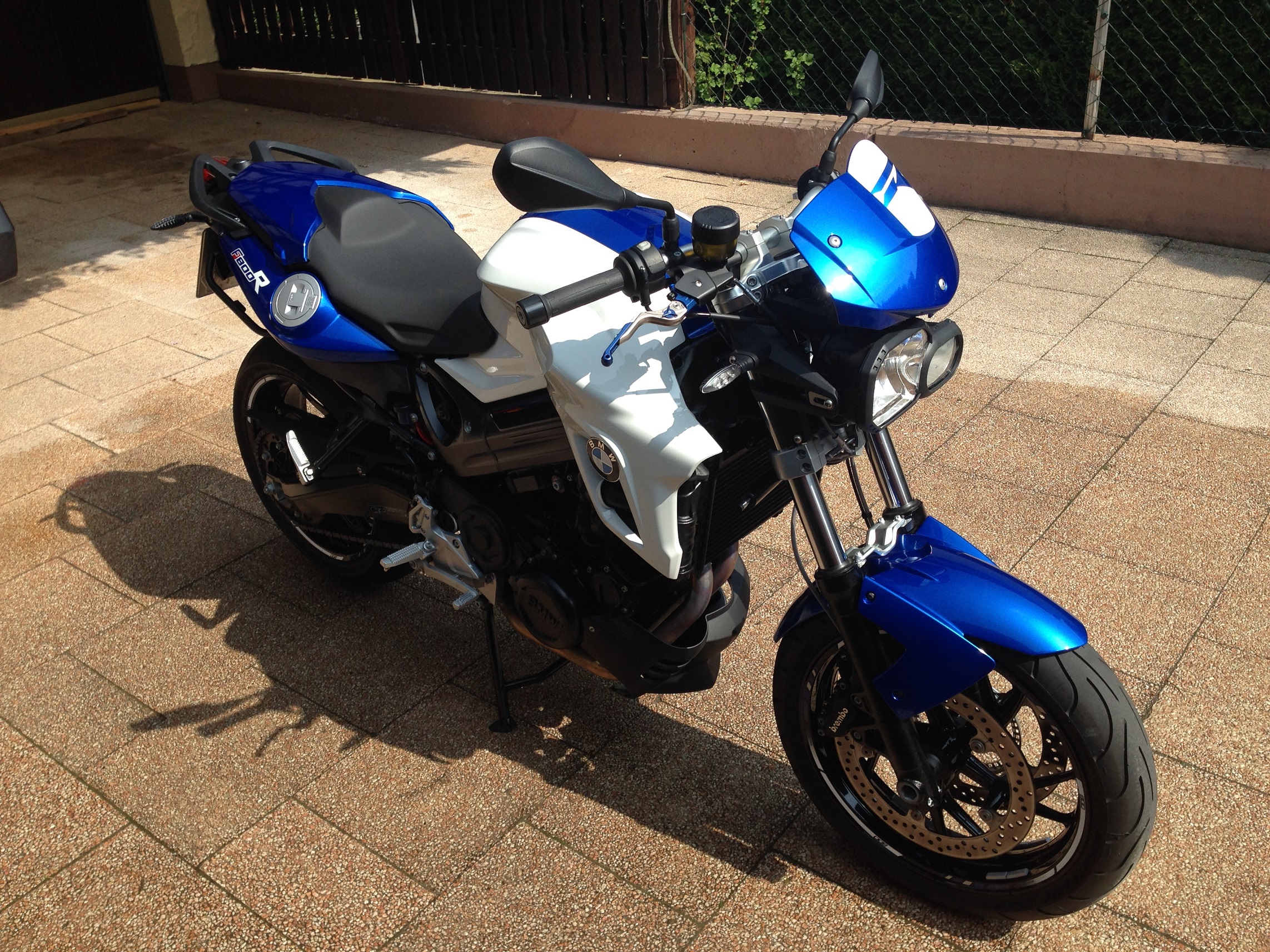 meine F800R, nun mit schwarzen Crash Pads, Gabel Stabilisator, Hebel von Schnitzer.