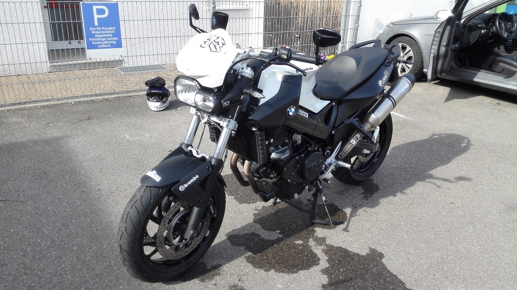 F 800 R BJ 09 / Aktuell: 14100km, weiß-schwarz, Highsider Spiegel, MV Lenkererhöhung, LED Blinker & abgetöntes Rücklicht, Sticker, LeoVince Auspuff, SW Motech Sturzpads