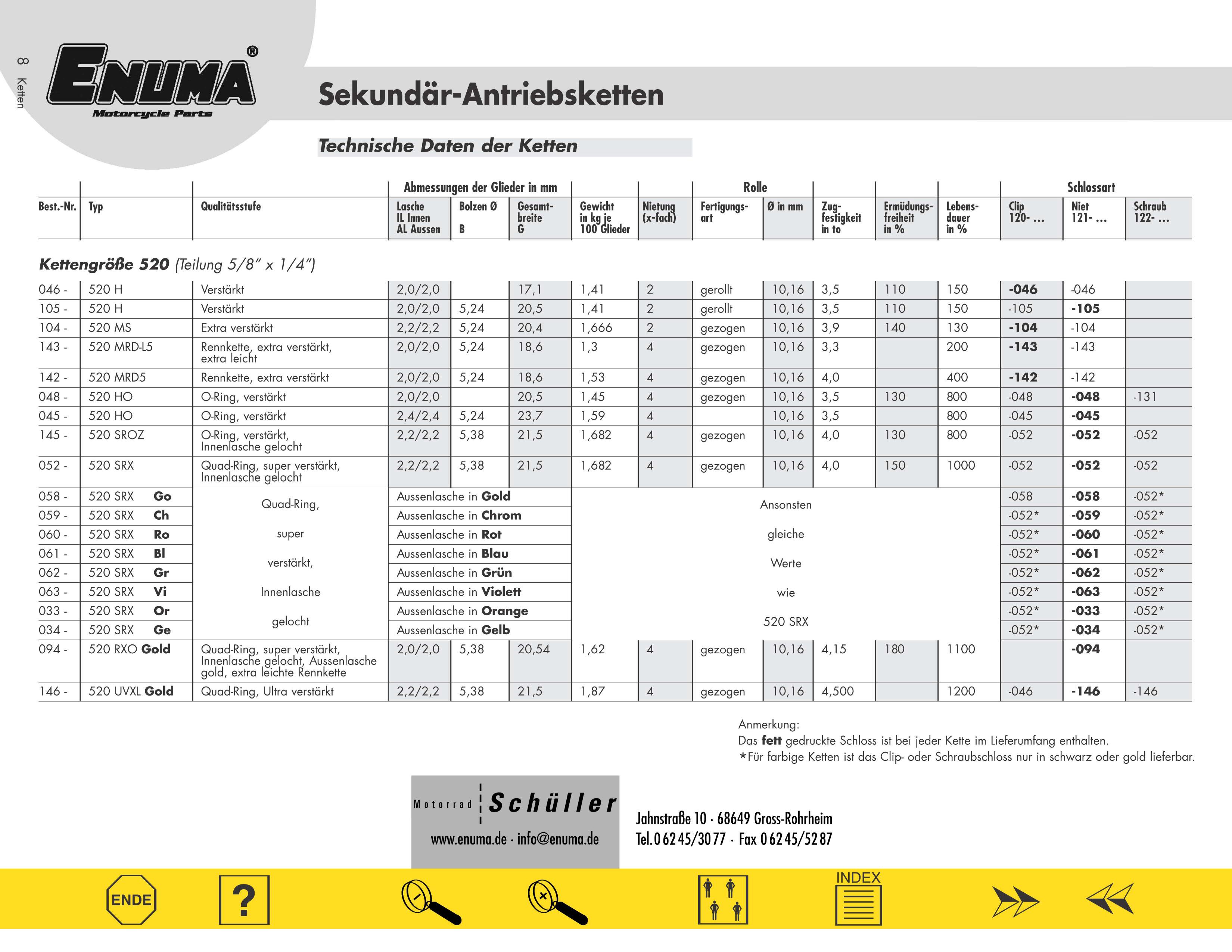 Wenn man also dennoch einmal die Zugfestigkeit als Merkmal für die Lebensdauer der jeweiligen Kette heranzieht, scheint sich zumindest die landläufige Verbrauchermeinung zu bestätigen, dass D.I.D.- und Enuma-Ketten zu den Top-Produkten zu zählen scheinen. Das scheint sich aber wiederum nicht zwingend mit einem (uralten) Test von Motorradketten zu decken, der 2007 von der Zeitschrift "Motorrad" durchgeführt wurde.