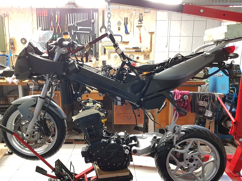 die Schwinge ist am Motorgehäuse montiert. Ich habe den Rahmen mit Gabel usw. mit einem Motorkran über Motor und Schwinge "gestülpt". War ohne Hilfe etwas schwierig...aber zu schaffen..