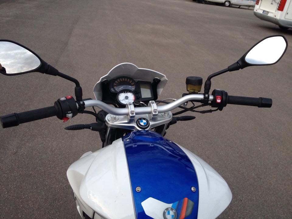 Der Lenker der GS ist etwa 14 cm breiter, die Kröpfung finde ich besser als beim R-Lenker, da sind mir ständig beide Hände eingeschlafen. Eine Lenkererhöhung war nicht nötig denn durch die Kröpfung kommt der Lenker automatisch höher.