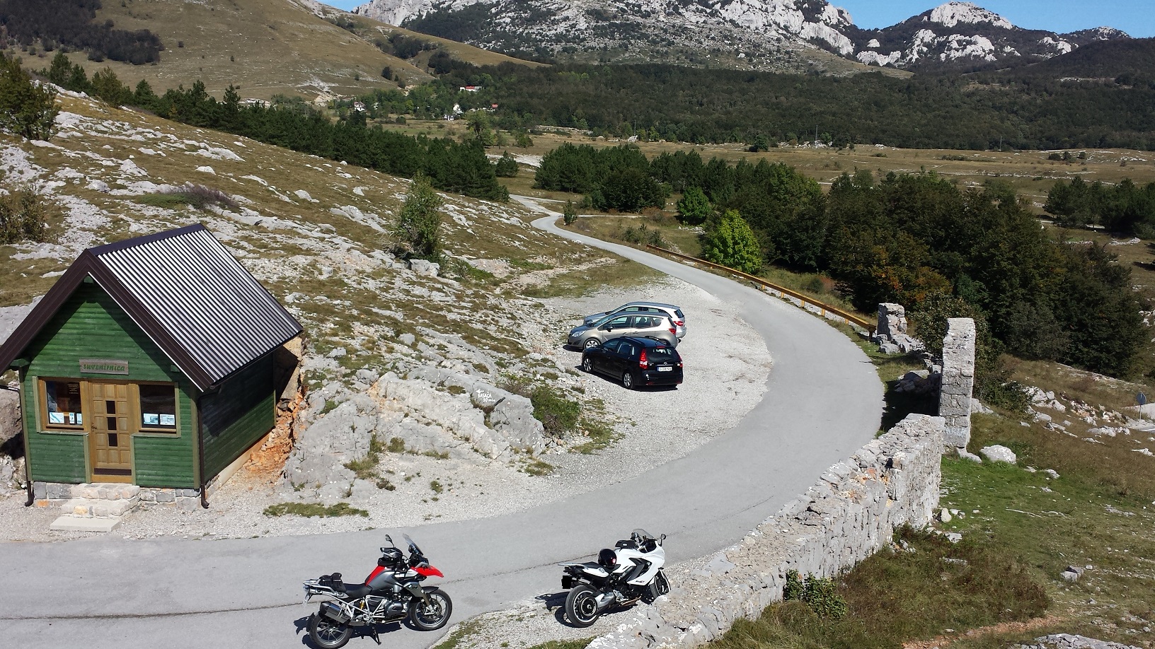 Es ging also morgens auf "der 8" (Küstenstraße) Richtung Posedarje, von dort wieder über die Berge Richtung Graçac. Von dort aus weiter nach Gospic, wieder über die Berge Richtung Karlobag. Hier hatten wir dann auch unsere erste Begegnung mit echten Spitzkehren. Tolle Kurven, aber leider haben die Kroaten dort den Asphalt angerauht. Für Autos bestimmt super, für Motorräder eher weniger. Meine GT hat dort wegen der Spurrillen und doch sehr unebenen Oberflächen ganz schön rumgezickt. Also Tempo raus und das Mopped nur irgendwie um die Kurve kriegen..