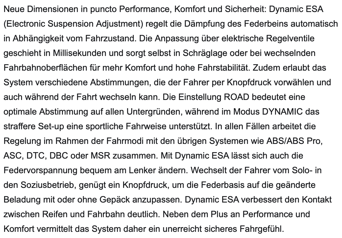 Von der F900XR weiß ich das diese eine "Dynamic" ESA verbaut hat mit 2 Stufen "Road & Dynamic" für die Dämpfung und 3 Stufen für die Federvorspannung (Beladungszustand). Ebenfalls habe ich auch gelesen, dass es sich um ein semiaktives Fahrwerk handeln soll.