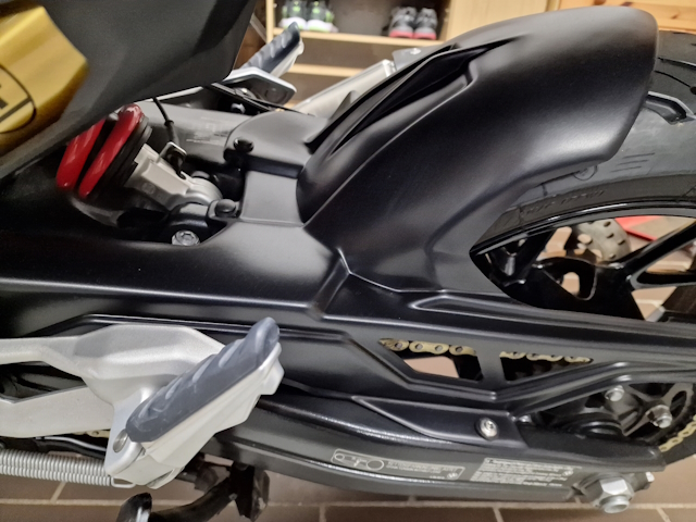 Kann es mir nur so erklären, dass durch die Verbreiterung der Fläche unter dem Kennzeichenträger weniger Schmutzwasser den Rücken des Fahrers/der Sozia trifft.