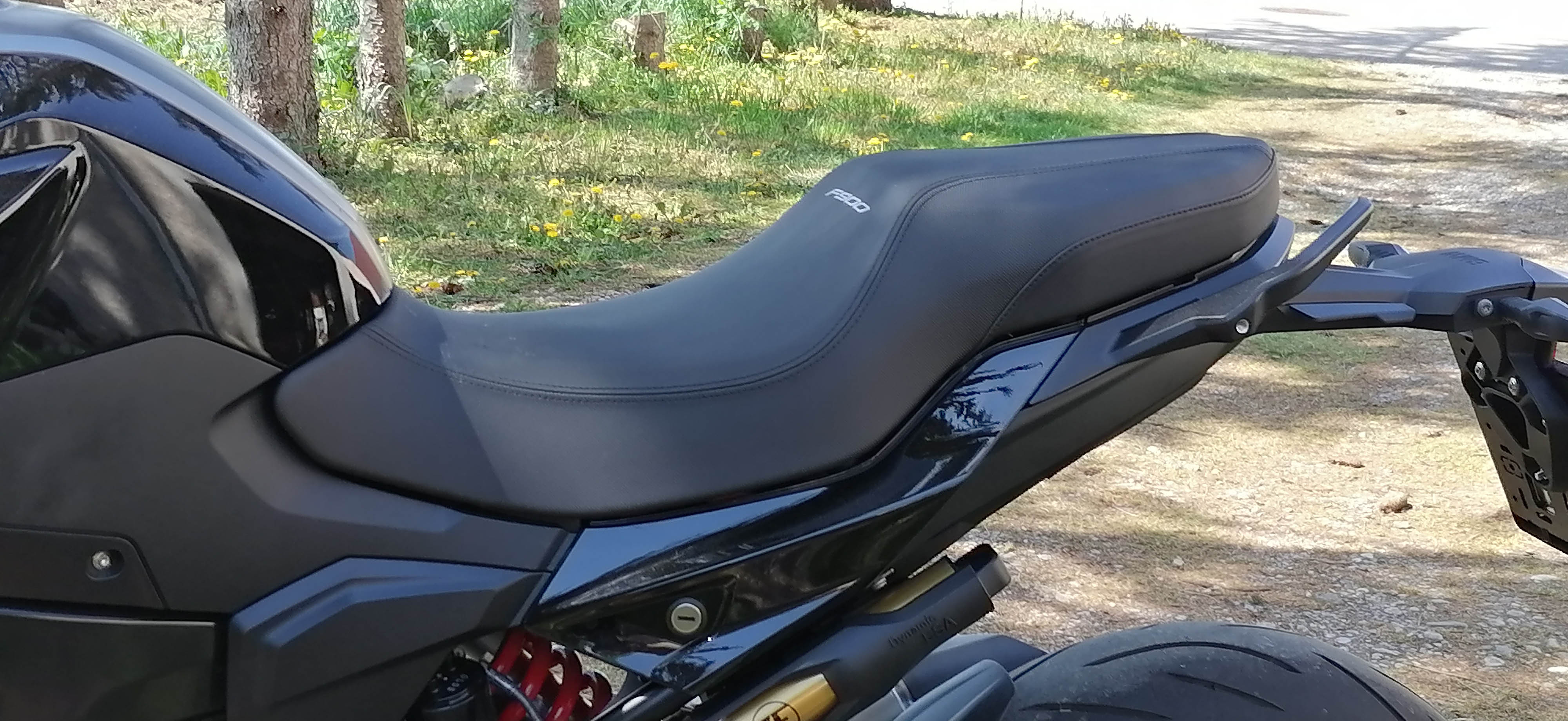 - bei der extra hohen Sitzbank ist der Fahrerbereich sogar höher (!) als der recht dünne Soziusbereich... Durch die Form der Nähte ist das optisch eine Art Extrakissen das da noch als Fremdkörper oben drauf gepflastert wurde? Optisch ein No-Go, ist mir bei der Präsentation einiger F900R Modelle auch schon aufgefallen.