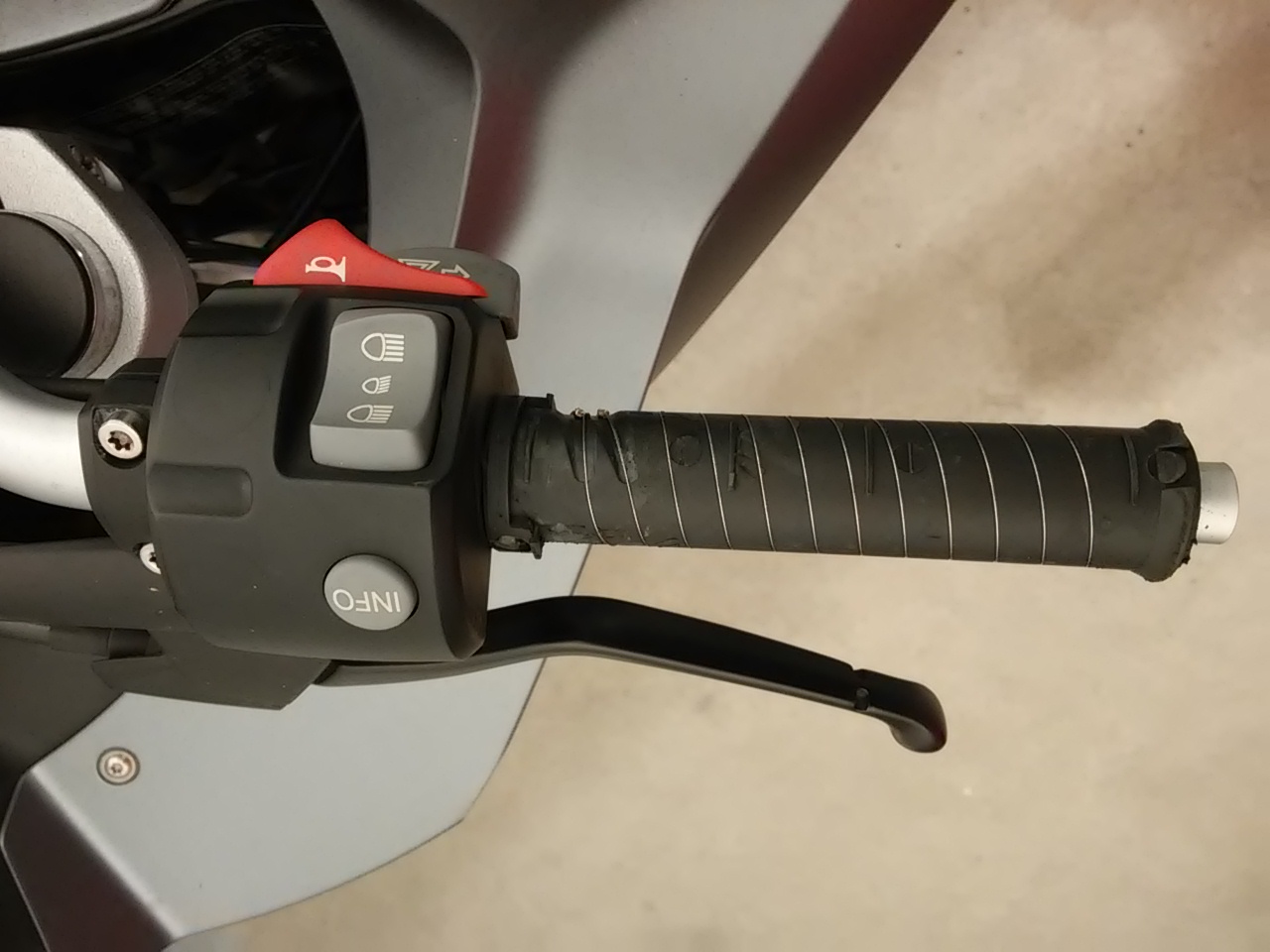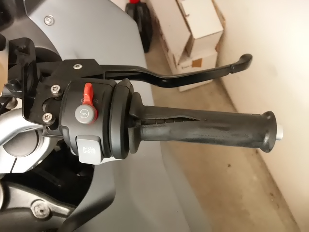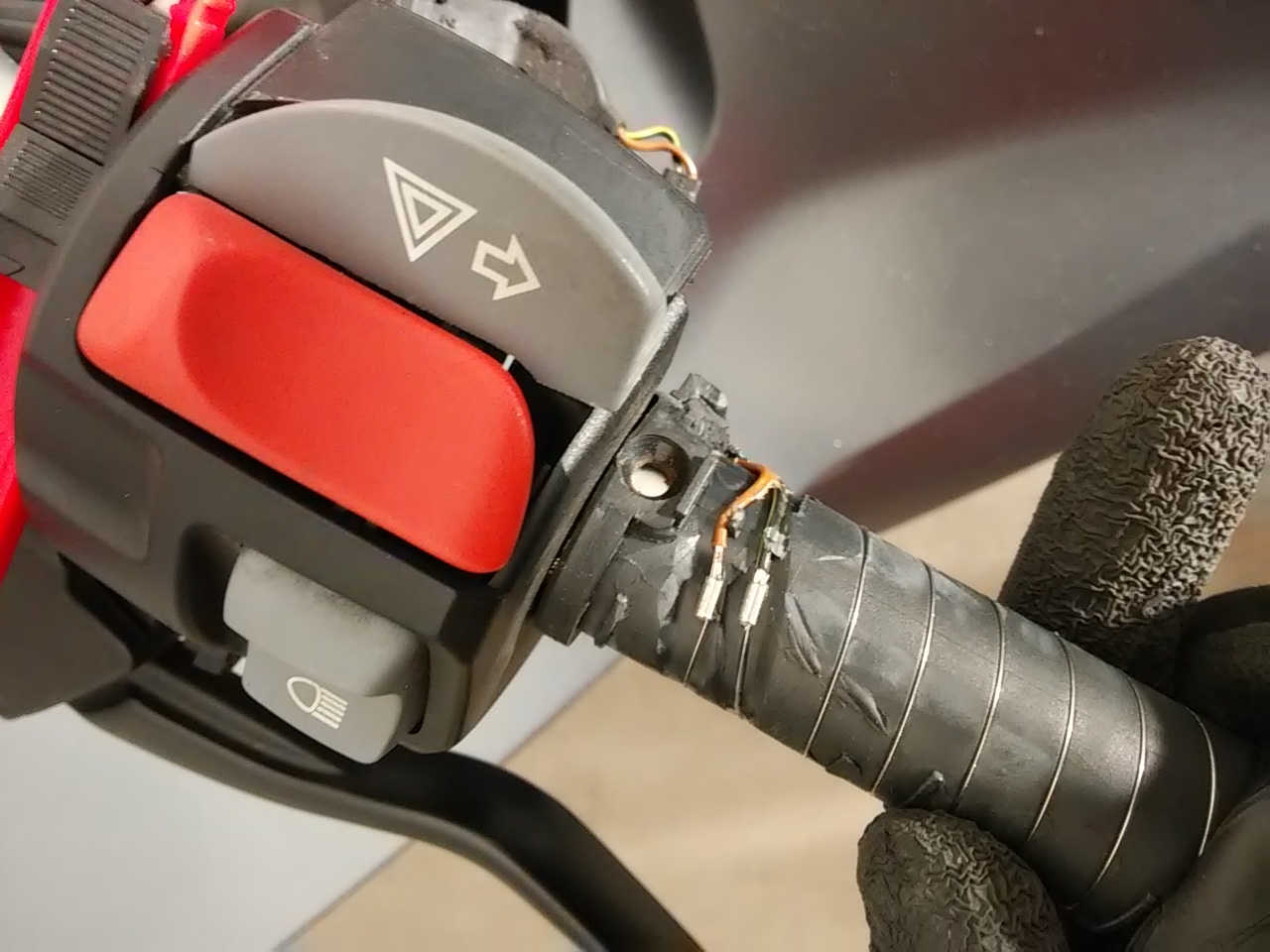Habe mit einem Heißluftfön den Gummi weich gemacht und dann versucht abzuziehen. Angefangen habe ich da bei den Schalterelementen, in dem ich vorsichtig den Gummi aufgeschnitten habe und dann abgezogen. Am Ende waren die Griffgummies also invertiert. Vorsichtig sollte man nur machen - Der Draht für die Griffheizung kommt aus den Schalterelementen raus und ist mit einer Plastiknase geschützt, die in das Gummi eingegossen ist. Mit etwas Fummelei kann man diese am Leben erhalten (ist mir erst beim zweiten Griff gelungen, nachdem ich am ersten Griff se abgebrochen habe). Die Gummis sind auch ein bisschen angeklebt, also braucht man am Anfang recht viel Kraft (hab das Motorrad fast ausgehebelt über den Ständer).