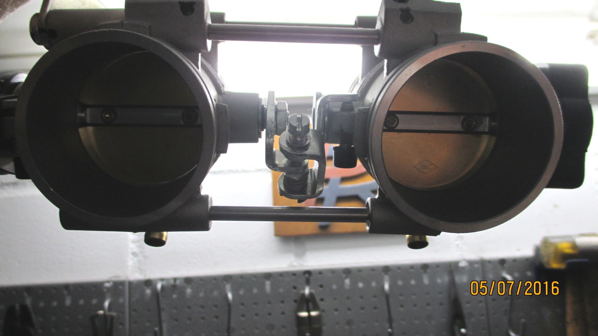 Hier mal 2 Bilder des F800 Drosselklappengehäuses. Am Lichtspalt erkennt man die schlampige Werkseinstellung der Verbindung der Drosselklappen, die jede einen eingestellten/gesicherten Anschlag haben.