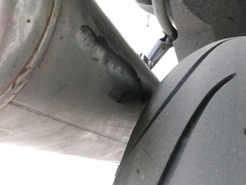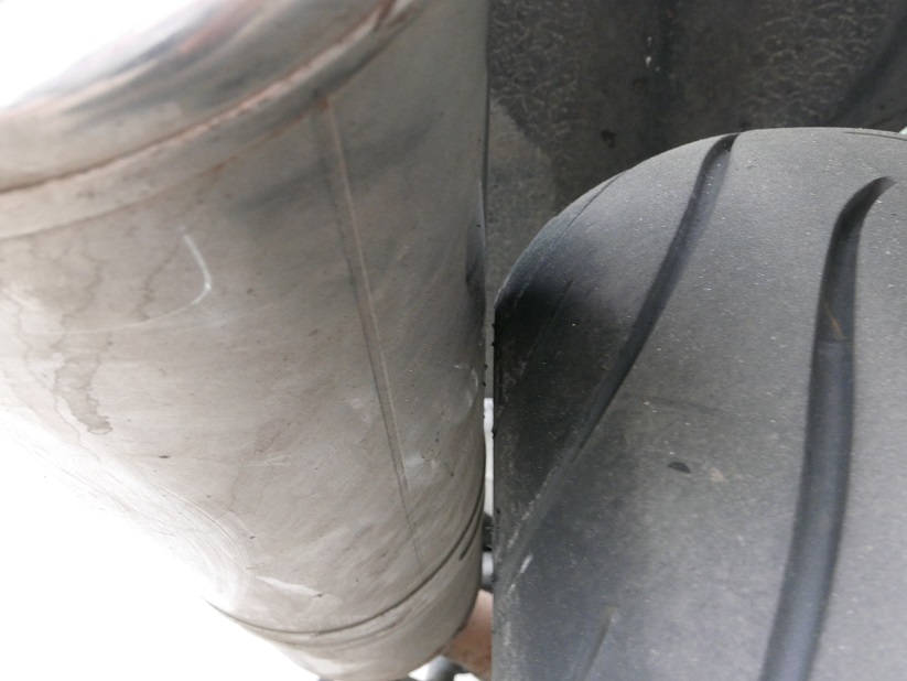 Das Hinterrad hat längere Zeit am Schalldämpfer geschliffen und deutlich Spuren des Reifengummis und Abriebflusen hinterlassen. Die Federung wurde wohl über einen großen Bereich beansprucht, da die Spuren nicht nur einen einzigen Radumfang beschreiben sondern sich über einen breiten Bereich andeuten.