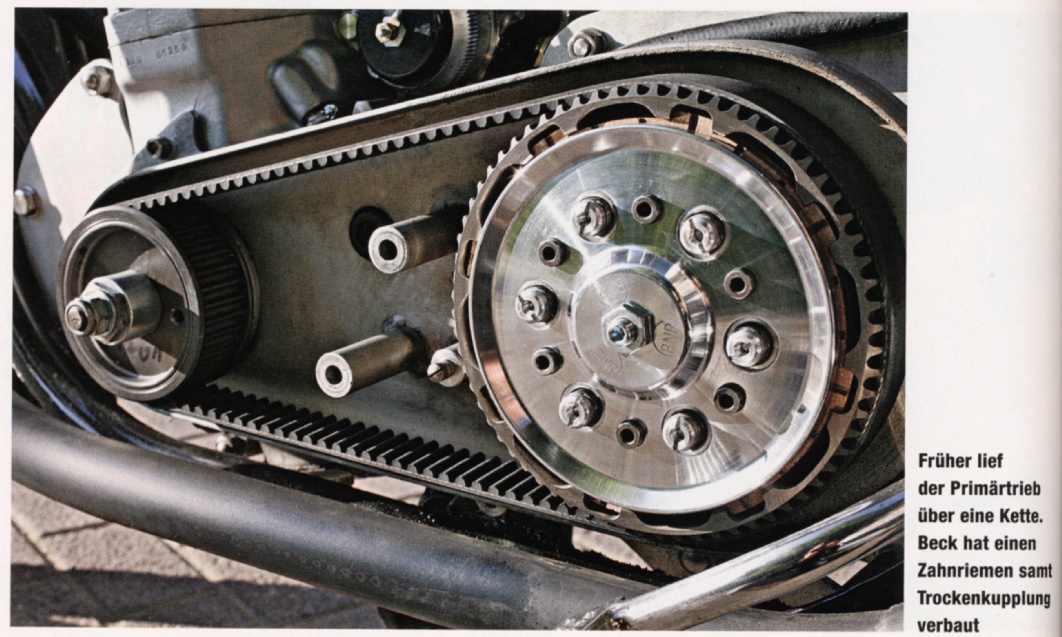 Beim Zahnriemen geht dies wegen der Vorspannung leider nicht. Er wird beim Ein- und Ausfedern immer ein wenig gedehnt. Dies geht nur in kleiner Größenordnung und daraus folgt, daß der Federweg eingeschränkt ist. Darum sind die Federwege der Zahnriemen getriebenen Motorräder auch kleiner als bei einem Kettenantrieb (oder Kardan). Also bei z.B. Harley.