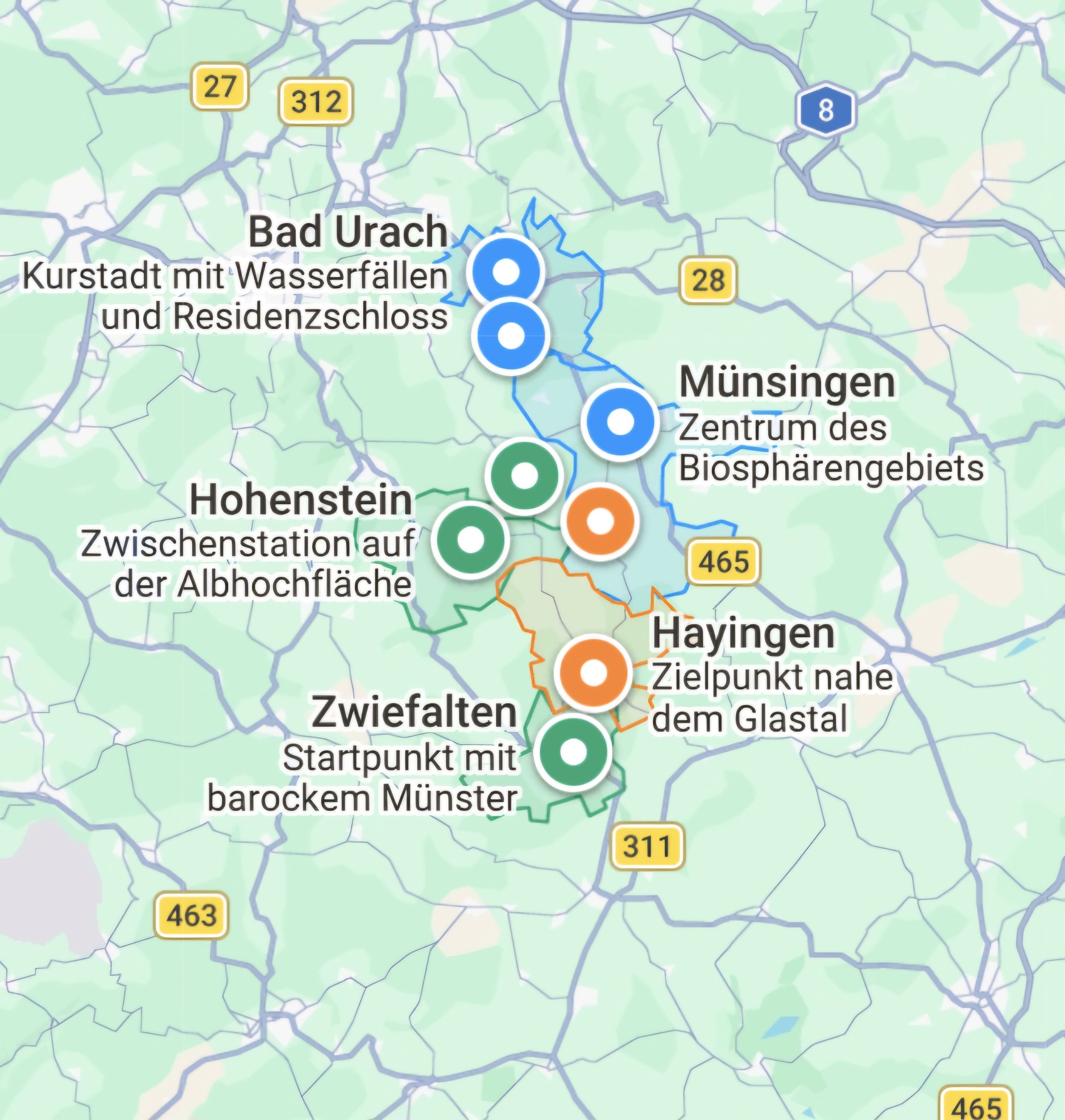 5. Hayingen – Zwiefalten: Das letzte kurze Stück schlängelt sich in einem schattigen Tal, vorbei an der Wimsener Höhle (Friedrichshöhle), der größten mit einem Floss befahrbaren Höhle Deutschlands. Gleich daneben finden die Gastronomieliebhaber eine Bio-Gaststätte, welche sich in der Hand eines bekannten Kochs, Simon Tress, befindet. Nach weiteren 10 km landet man in Zwiefalten. Neben der Zwiefalter-Brauerei und dem sehenswerten barocken Münster, gibt es noch einen inoffiziellen Biker-Treff am Café Böck. Zu jeder Tageszeit trifft man hier mindestens 20 bis 30 Motorradfahrer für nette Benzingespräche. Im „Bierhimmel“, ebenfalls an der Hauptstraße, können die Bierliebhaber einkaufen. Gastronomisch wären noch die Brauereigaststätte und vor allem der „Felsen“ in Zwiefalten-Baach zu empfehlen.