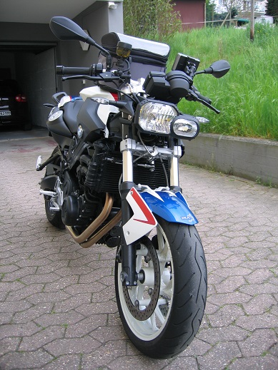 F800R - ABS - Farbe schwarz/weiß - Modell 2011 - Sportkoffer - GSG Sturzpads + Achspads vorne und hinten. - Navi: TomTom UrbanRider- Gepäckbrücke schwarz - SBK-Lenker schwarz - Hattech DarkStyle ESD - kurze V-Trec Brems-/Kupplungshebel, SW-Motech Hauptständer - LED-Rücklicht -Bereifung: Michelin Pilot Power