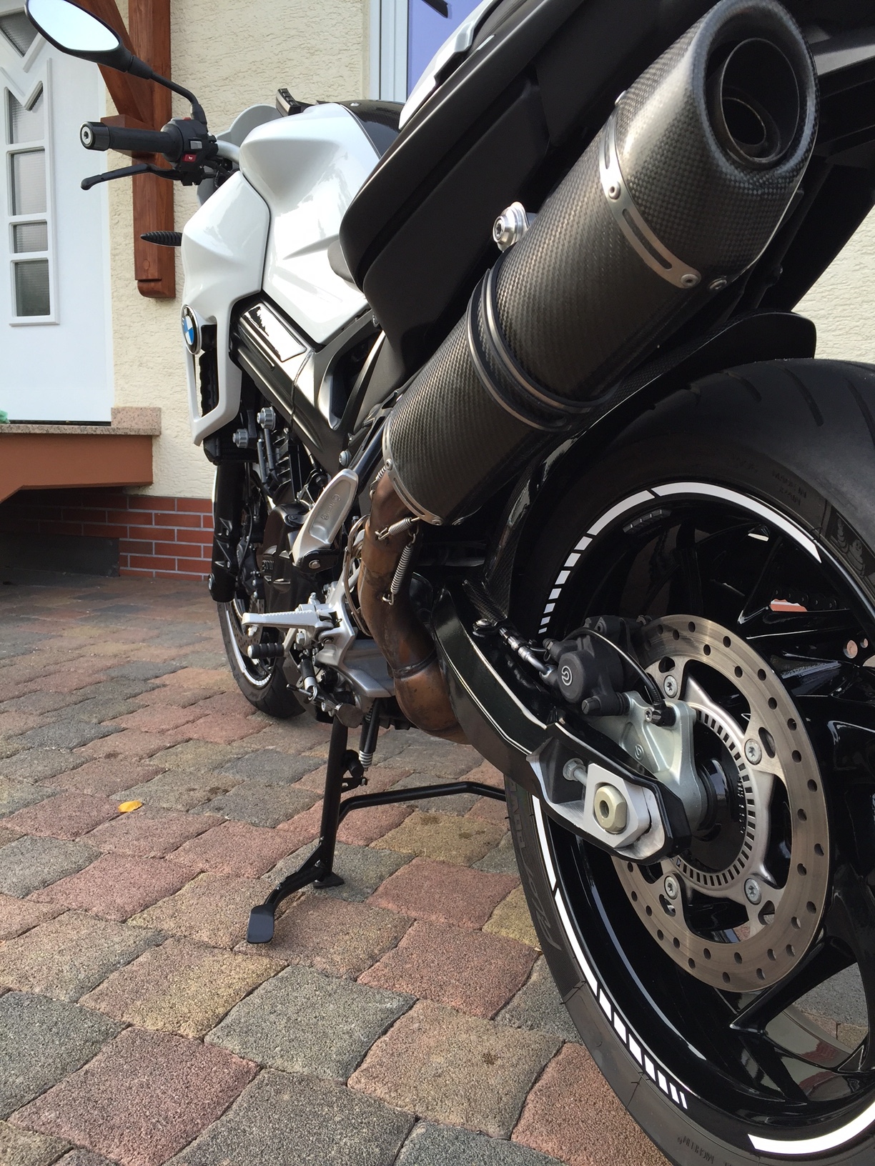 F 800 R BJ 09 / Aktuell: 14100km, weiß-schwarz, Highsider Spiegel, MV Lenkererhöhung, LED Blinker & abgetöntes Rücklicht, Sticker, LeoVince Auspuff, SW Motech Sturzpads