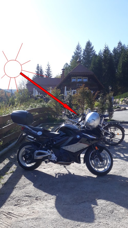 Nur zum allgemeinen Verständnis, hatte das Motorrad wie auf dem Foto (Sonne von hinten, Helm nicht am Motorrad) abgestellt, danach war der Schaden an der Instrumentenblende sichtbar.