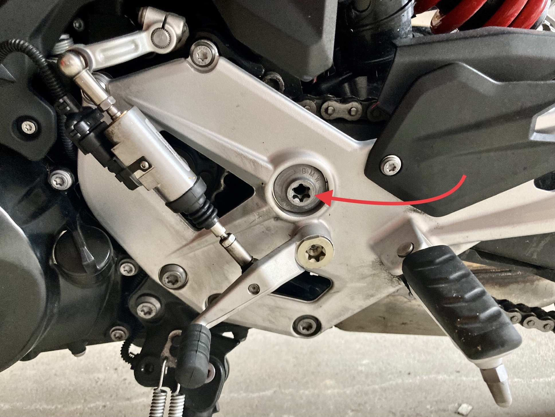 Aber, dazu muss leider die Schraube vom Lager der Hinterradschwinge gelöst werden (siehe Bild)