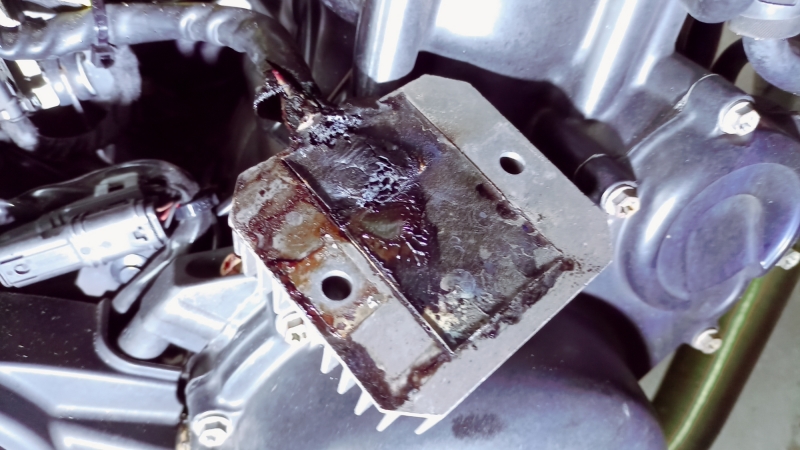 Zum Glück sind die meisten Reglerdefekte in dem Sinne harmlos, dass sie keine zusätzlichen Gefahren realisieren. Aber bei kurzschlussähnlichen Defekten kann eine sehr hohe Leistung frei werden, weil die Regler direkt mit der Batterie verbunden sind, die auch nach dem Abstellen des Motors weiter Energie liefert, bis sie leer ist. Schon im Normalfall setzt sie beim Betrieb des Anlassers 1 Kilowatt frei, bei Kurzschlüssen kann es das Mehrfache sein ! Zwar ist sie dann auch nach kurzer Zeit leer, aber diese Zeit reicht aus, das Motorrad in Brand zu setzen, wenn diese Leistung an der falschen Stelle freigesetzt wird, etwa im Regler, der dafür nicht ausgelegt ist.