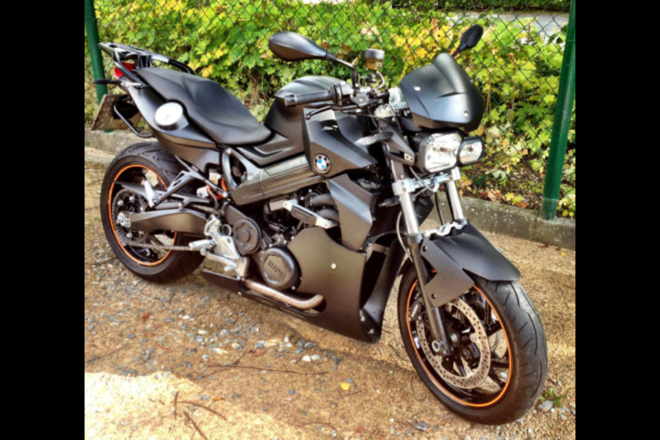 BMW F800R, matt schwarz, BC, ABS, Griffheizung, AC Schnitzer Spoiler, AC Schnitzer Sturzpads, BMW Kühlerblende, Koffersystem BMW, Leo Vinci Auspuff, LED Blinker, orange farbenes Felgenband, Soziusabdeckung in matt schwarz und orange, Touratech Scheinwerferabdeckung, Husqvarna Nuda Hinterradabdeckung, Ventilkappen mit BMW Logo, Kurzhubgasgriff von Schwabenmax