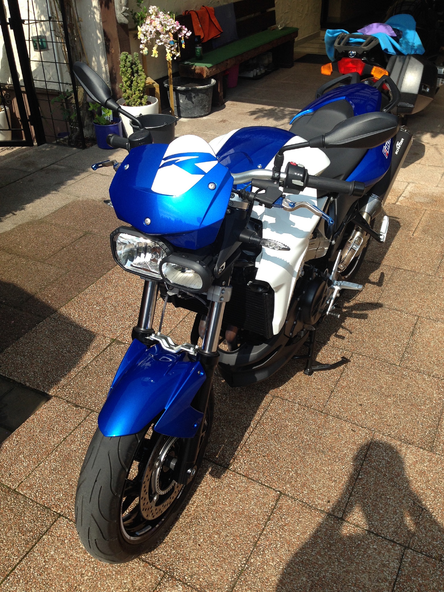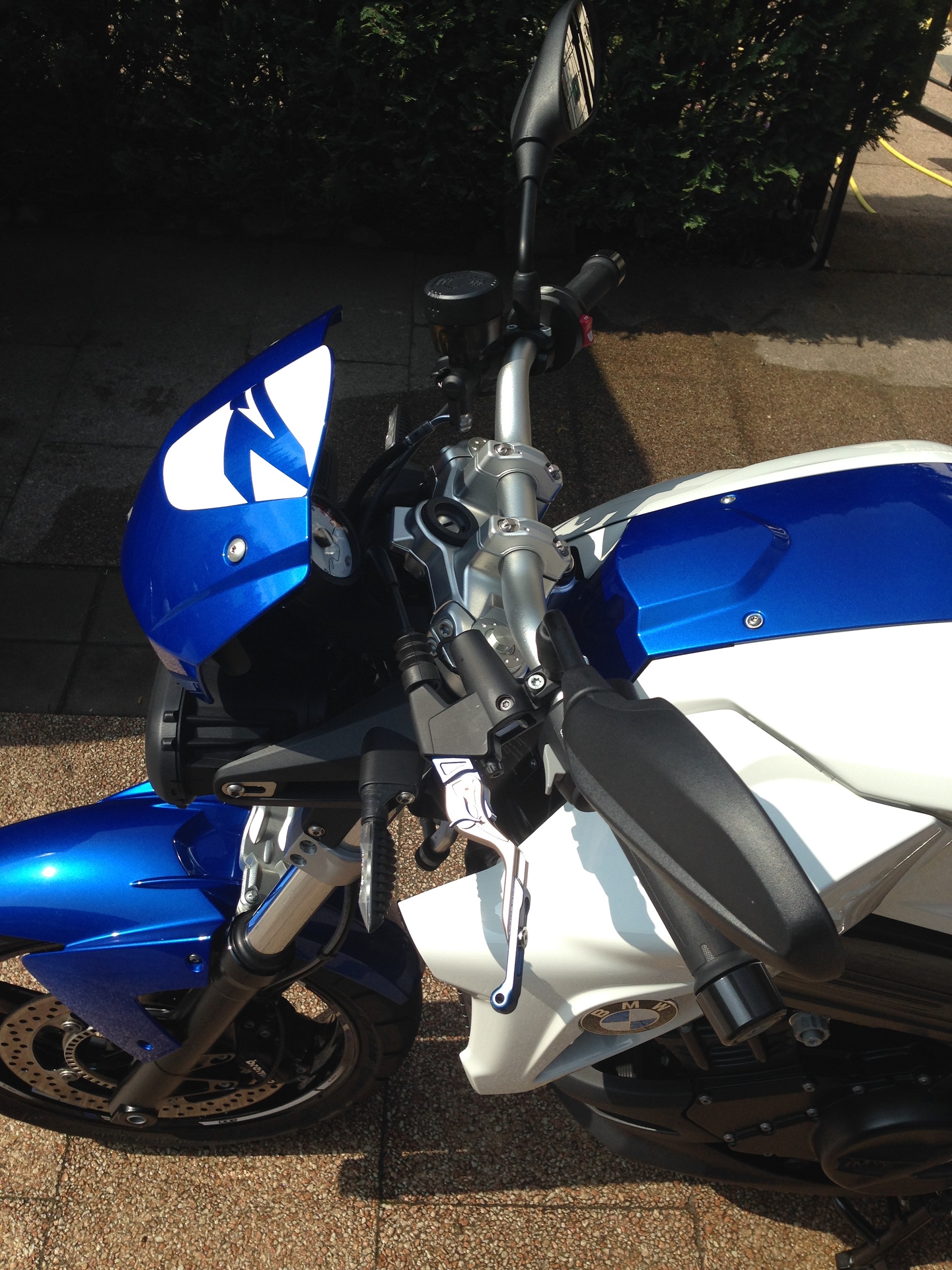 meine F800R, nun mit schwarzen Crash Pads, Gabel Stabilisator, Hebel von Schnitzer.