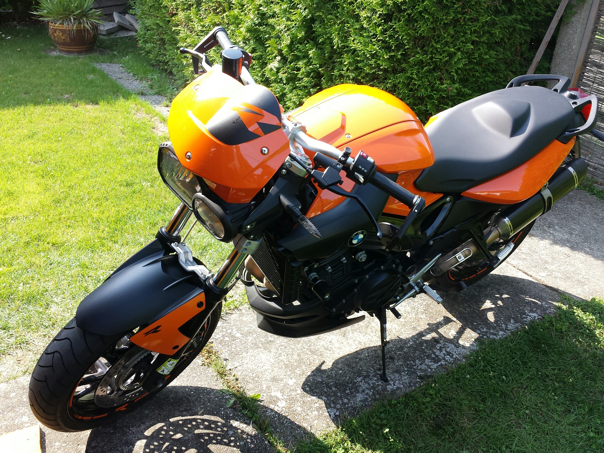Nach meiner ersten F800R, die bis auf den SC-Project Auspuff, BMW Motorspoiler, BMW Sitzbankabdeckung, BMW Kühlerblende und weiß reflektierenden Felgenrandaufkleber Original blieb, folgte nun die zweite F800R.