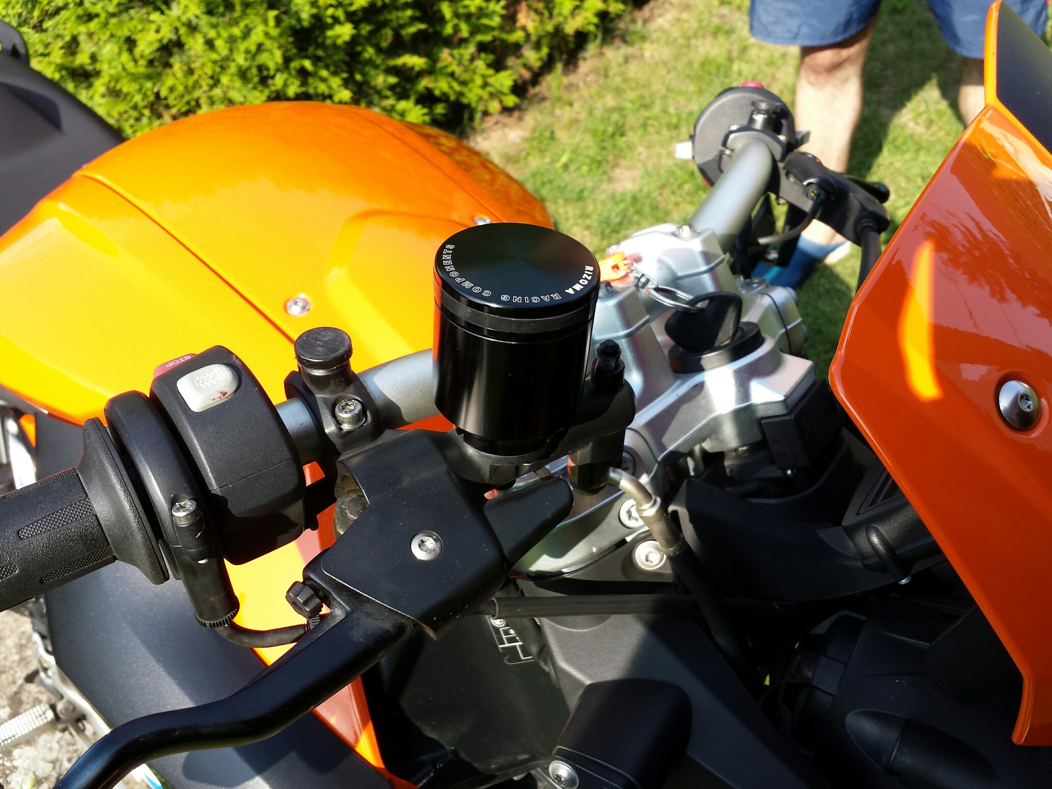 Nach Umbau: Komplett Sakhir Orange metallic außer "Tankabdeckung" Mitte, AC-Schnitzer Motorspoiler, Spark Auspuff Black Edition (WOW noch dumpfer als SC Project, einen zweiten Spark Auspuff hab ich noch über!), Ralle Tankschutzcover mit stilisiertem R, 19er Ritzel mit Gummiring (19er Ritzel ohne Gummiring hab ich ebenfalls noch über!).