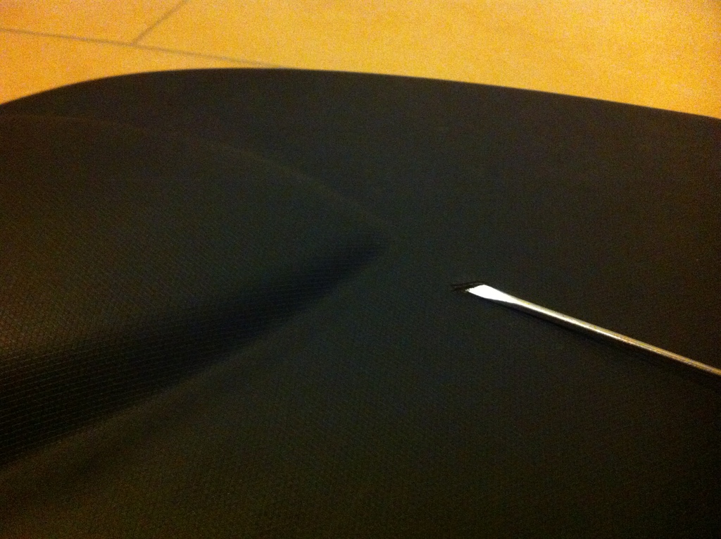 Zuhause löste ich erst einmal die Klammern unter dem Sitz um dann den Bezug vom Polster zu trennen. Leider musste ich feststellen, dass der Bezug am Polster festgeklebt ist.