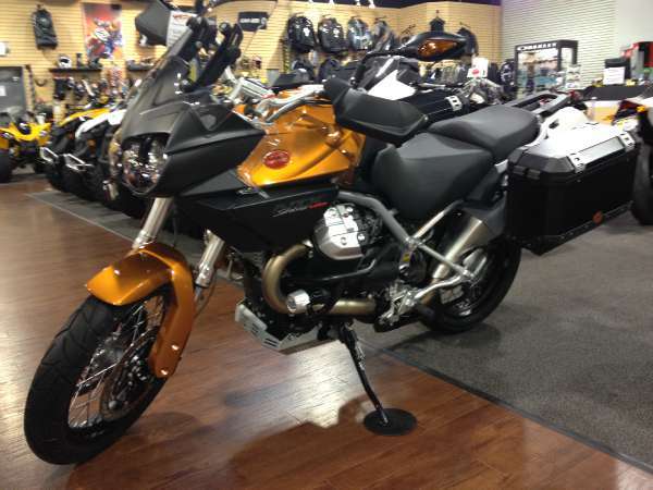Die Tankanzeige ist total ungenau. In 70min Fahrt habe ich den 32L Tank angeblich halb leer gefahren. Spritverbrauch, sagte der Händler, sei hoch, aber das wäre die Tankanzeige. Der erste Gang ist einmal erst nach mehreren Versuchen drinne gewesen, das sie Guzzi typisch. Die Kupplung ist viel zu kraftanstrengend. Die Farbe (orange) die mir wirklich gefällt, gibt es nur in USA (warum es für Europa und USA andere Farbschema gibt, war auch für den Händler nicht verständlich). Der Kardan holpert. Auf der Autobahn, 6ter Gang, von 120 auf 200 hoch, geht konstant die Warnleuchte der Traktionskontrolle an.