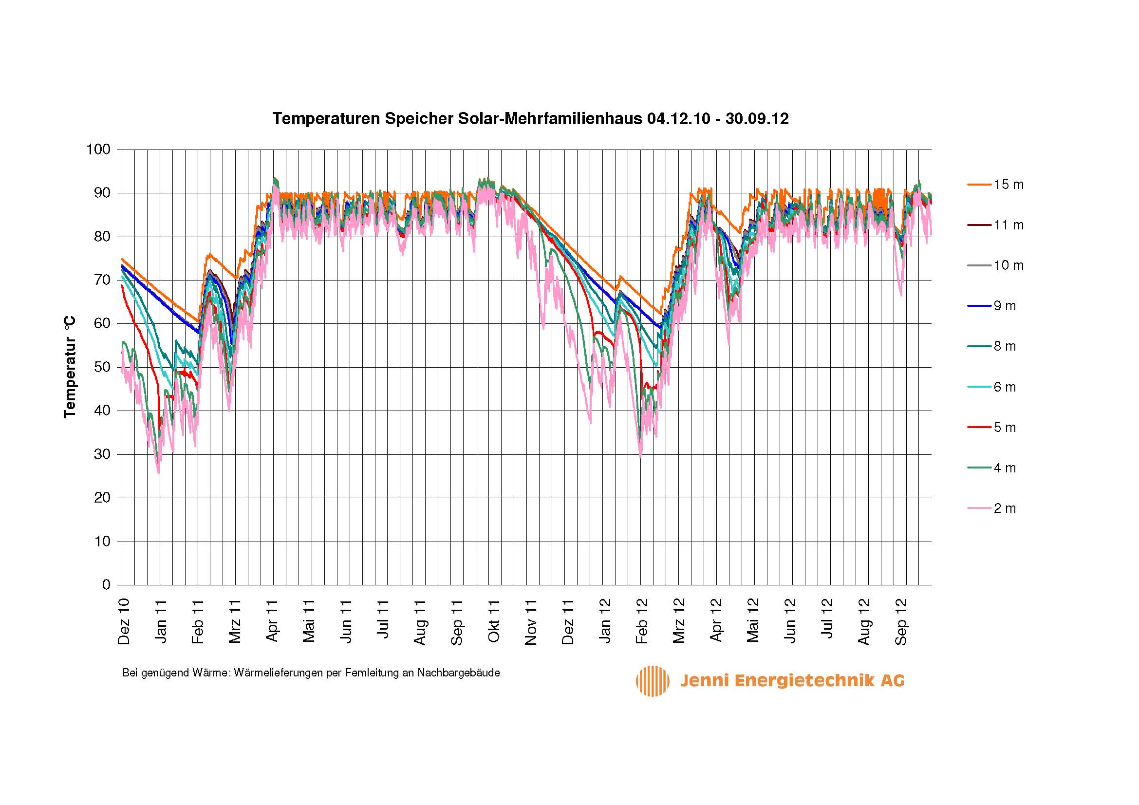 Im Sommer bekommt man das Wasser fast zum Kochen bzw. bis zur Abschalttemperatur der Anlage (ca. 83°C), jedoch über das Winterhalbjahr muss man zuheizen (bei uns per Holz-Wasser-Heizung), da das Fluid in den Kollektoren durch die Sonnenstrahlung nicht genug aufgeheizt wird um Energie über den Wärmetauscher an den Speicher abgeben zu können.