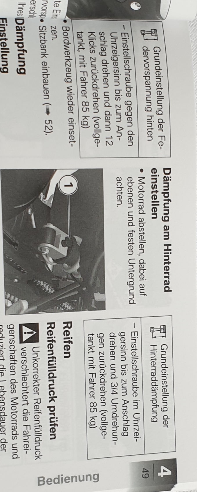 Andererseits scheint BMW ohnehin Probleme zu haben, die Einstellvorgaben für's Fahrwerk klar auszudrücken. Bei der NineT habe ich bei BMW interveniert und prompt wurde dann das Manual dahingehend geändert.