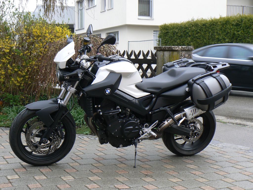 F800R - ABS - Farbe schwarz/weiß - Modell 2011 - Sportkoffer - GSG Sturzpads + Achspads vorne und hinten. - Navi: TomTom UrbanRider- Gepäckbrücke schwarz - SBK-Lenker schwarz - Hattech DarkStyle ESD - kurze V-Trec Brems-/Kupplungshebel, SW-Motech Hauptständer - LED-Rücklicht -Bereifung: Michelin Pilot Power