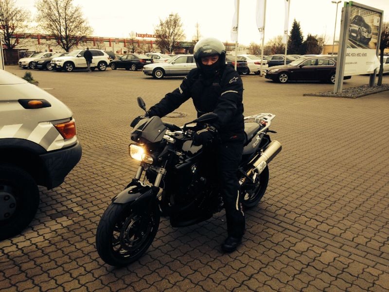Zu mir: ich bin Spätzünder, d.h. 46 Jahre alt und habe den A-Schein erst im Oktober gemacht. Vorher bin ich 2 Jahre mit einem 50er Roller durch Berlin gedümpelt, dass war mir dann zu langsam und so hatte ich mir im Juni 2012 ein Dreirad (Quadro 350d) zugelegt. Wenn das Ding fuhr hat es viel Spass gemacht, leider hatte das Teil immer wieder Probleme gemacht (insbesondere mit der Kraftstoffzufuhr) so dass ich das Teil nach 14 Monaten und 3000 Km entnervt gewandelt habe. Dann hatte ich eigentlich vor mir eine Fuoco 500 zu kaufen (ebenfalls Dreirad), die muss man jedoch umbauen, um es mit PKW Führerschein zu nutzen. Der Umbau hätte ca € 1400,- gekostet. die Piaggio Dreiräder gefallen mir nicht, der Peugeot Metropolis ist mit € 8500,- auch kein Schnäppchen, also entschloss ich mich nochmal die Fahrschule zu besuchen. 6 Wochen später war ich stolzer Besitzer des A-Scheins! Der Führerschein hat mich mit allen Gebühren nur €883,- gekostet! Fest entschlossen mir den BMW Roller C600Sport zu kaufen, habe ich Ausschau gehalten. Als ich dann mal eine Probefahrt gemacht habe, war ich doch ernüchtert - Motorrad-Feeling kommt doch nicht auf. Obwohl die Argumente für einen Roller in der Stadt vielfältige sind (Automatik, Stauraum) war ich dann doch überzeugt ein Motorrad wäre das Richtige für mich! Gelernt habe ich auf einer F700GS - schließlich nach langen Überlegungen und diversen Besichtigungen war dann doch die F800R mein Wunschmotorrad!