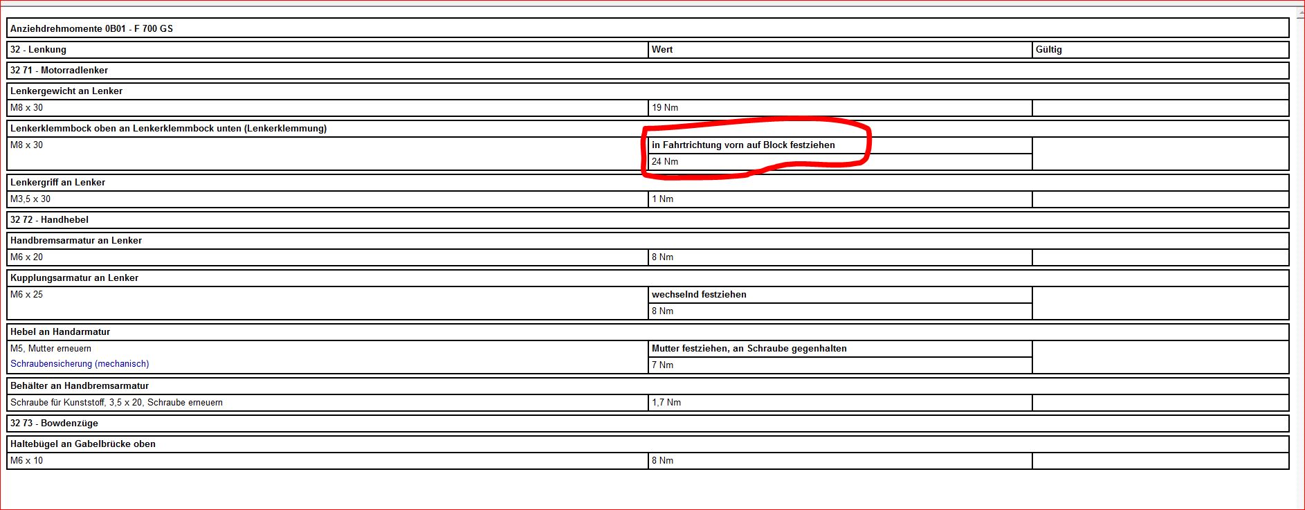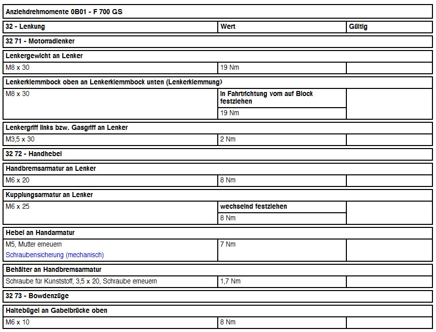 funkmesser hat geschrieben:ich weis ein bischen spät für die Antwort. Aber BMW schreibt 24 Nm vor. Andere Anzugsdrehmomente machen keinen Sinn da die Lenkererhöhung mit längeren Schrauben auch wieder in die Orig. Gabelbrücke eingeschraubt werden.