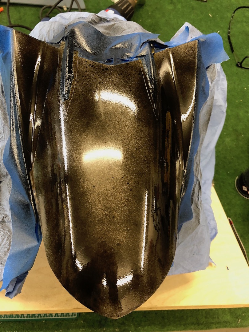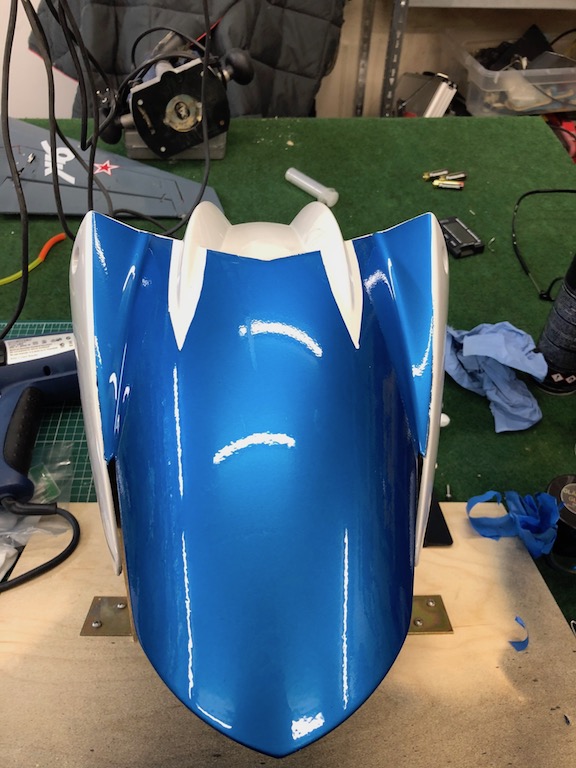 Vorarbeiten (säubern mit Frosch Glasklar, abkleben) und dann die erste Schicht schwarz matt aufnebeln. Kurz warten und ich hab mit der Steinel Heissluftpistole immer ein bisschen nachgeholfen. Man erkennst schön wenn der lack trocken ist (matte Oberfläche). Dann noch 3 nasse Schichten schwarz oben drauf. Dann eine Royal Blue Pearl aufgenebelt und nach 5 Minuten eine nasse oben drauf. Nun kommen noch 2-3 Schichten davon und zum Schluss eine Nebelschicht transparent UV Glossy und 2-3 nasse hinterher.