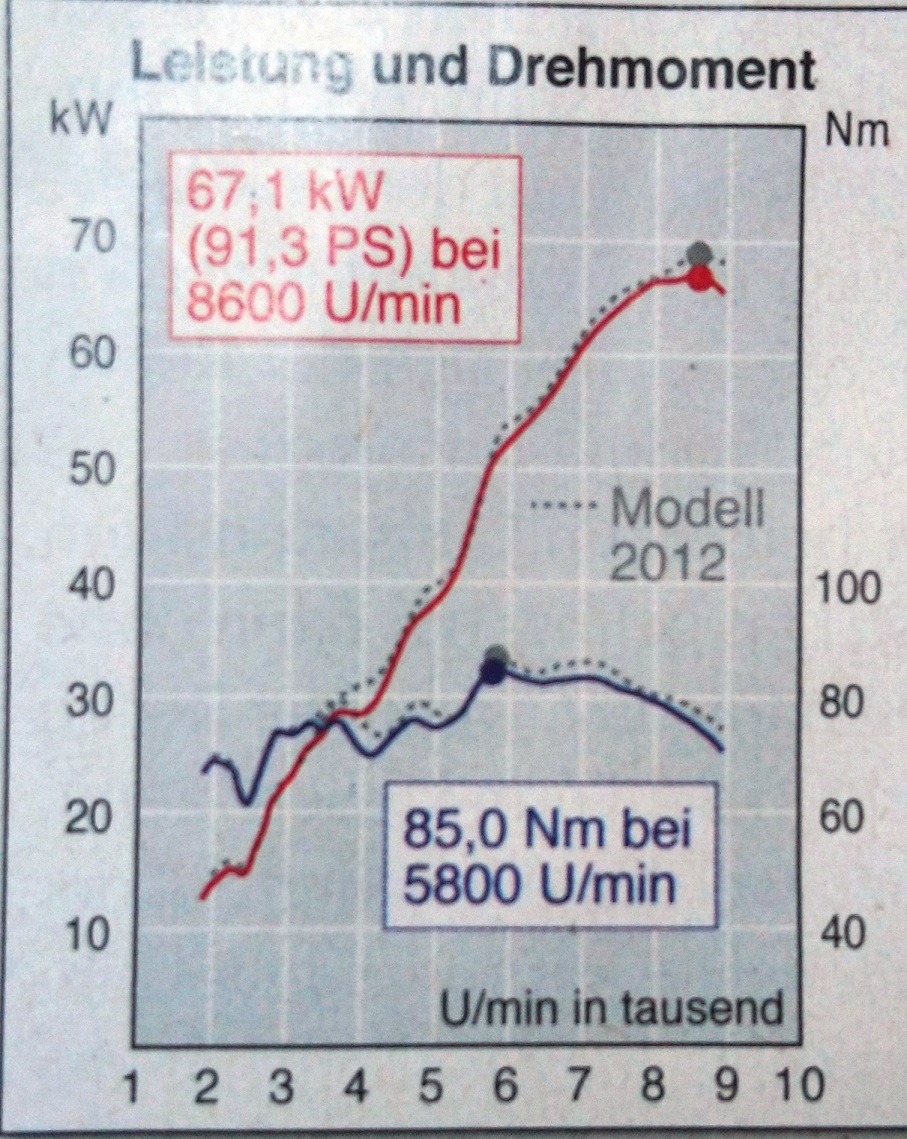 Und auch der Bereich des maximalen Drehmoments, also so bei 5700 bis 7000min-1 ist jetzt in diesem Dreierdiagramm (nur EINMAL EINE schmale Spitze mit etwa 86Nm) plötzlich schlechter als im Test der Zeitschrift MO (ZWEI Spitzen mit jeweils etwa 88Nm, also ein breiter hochliegender Bereich).