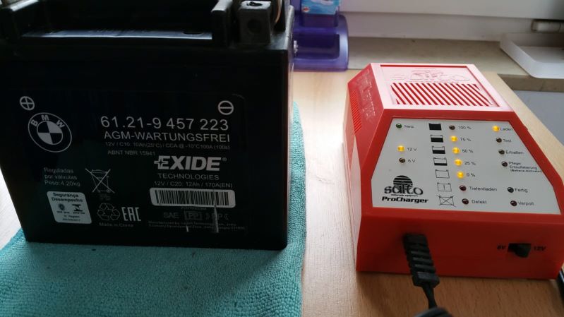 Da ich auch im Winter gelegentlich fahre, wenn das Wetter das zulässt, kommt es selten zu langen Fahrpausen. Die 4 Wochen in der BMW-Anleitung, ab der ein Nachladen nötig sein kann, wenn die Batterie nicht abgeklemmt wurde, sind auch nur ein Richtwert, der evtl. (je nach Motorradtyp und Ausstattung) auch überschritten werden kann. Sind sehr lange Fahrpausen ausnahmsweise doch zu erwarten, klemme ich die Batterie ab. Ein Ladegerät kommt nur ausnahmsweise zum Einsatz, etwa zur Inbetriebnahme einer neuen Batterie oder wenn die vorhandene Batterie wegen Defekten oder einer Fehlbedienung leergezogen wurde.