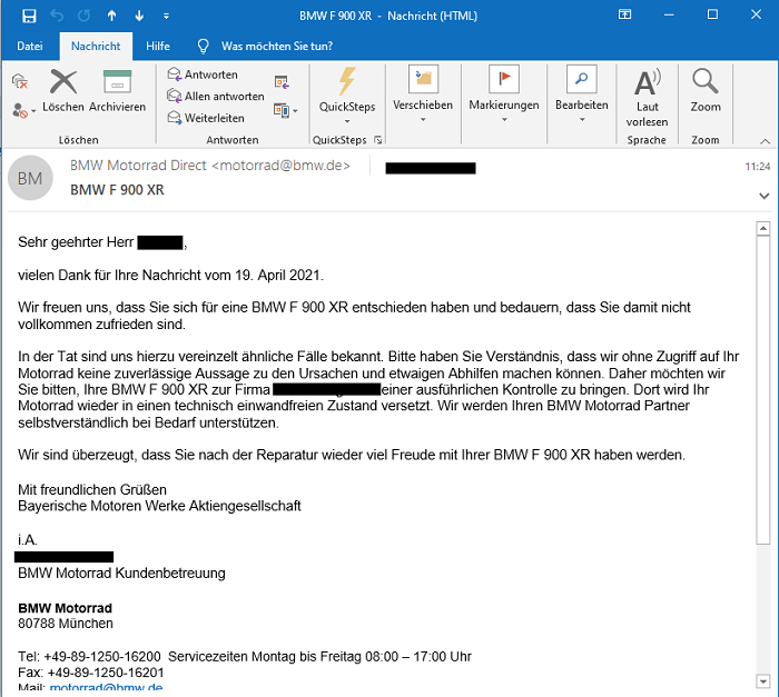 Rückruf:" BMW weiß nicht von solch einem Verhalten, und in den Foren schreibe alle sowieso nur Sch***e."