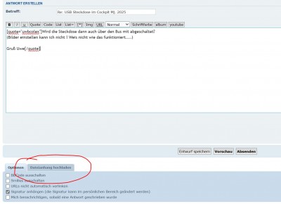 "Dateianhang hochladen" wählen, Bild heraussuchen und hochladen. Dann steht das Bild unter