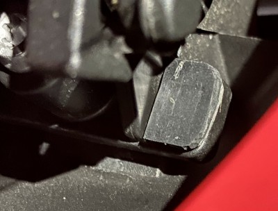 Aaaaber... da ich die Handschutzbügel von Evotechparts montiert habe, kommen sich bei Volleinschlag des Lenkers nun die Bügel und die MRA Scheibe in der unteren Position in die Quere. Zwar nur leicht, aber ein findiger Prüf-Ingenieur würde das bei der HU sicherlich bemängeln. Ausserdem finde ich das selber auch doof. Also habe ich mir die Mechanik der Scheibenaufnahme mal genauer betrachtet. Entgegen meiner Annahme, dass die untere Position durch diese beiden oberen Gummipuffer begrenzt wird, befindet sich unten im Bereich der Feder der eigentliche Anschlag. Hebeltechnisch macht das dort auch mehr Sinn, als unten eine Feder einzusetzen und oben den Weg zu begrenzen, da sonst eine gewisse und unnötige Spannung entsteht. Ich habe einfach links und rechts ein Stück Gummi (2 oder 3mm) auf den Anschlag geklebt und alles ist gut. Als Nebeneffekt steht die Scheibe in der unteren Position nun ein klitzekleines Stückchen steiler.