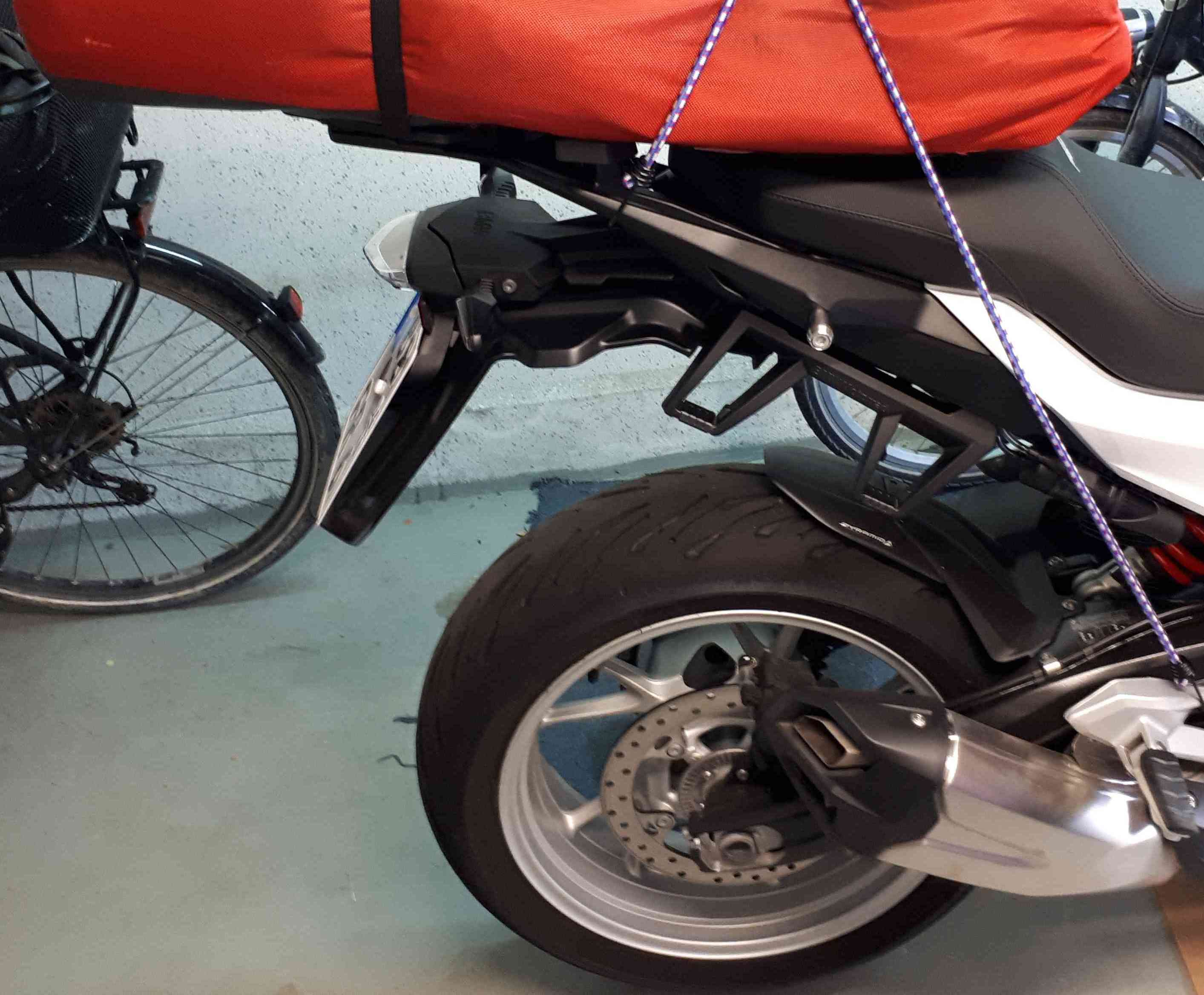 Die Löcher und Befestigungsschrauben des S1000er Spritzschutzes passen exakt in die Löcher hinterm Nummerschild der F900XR!