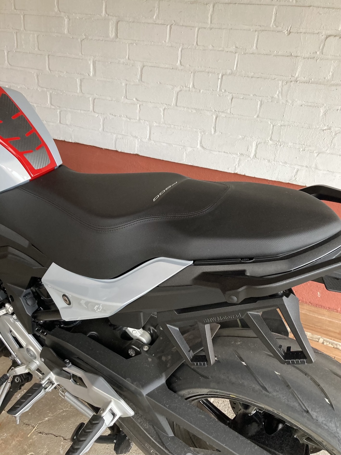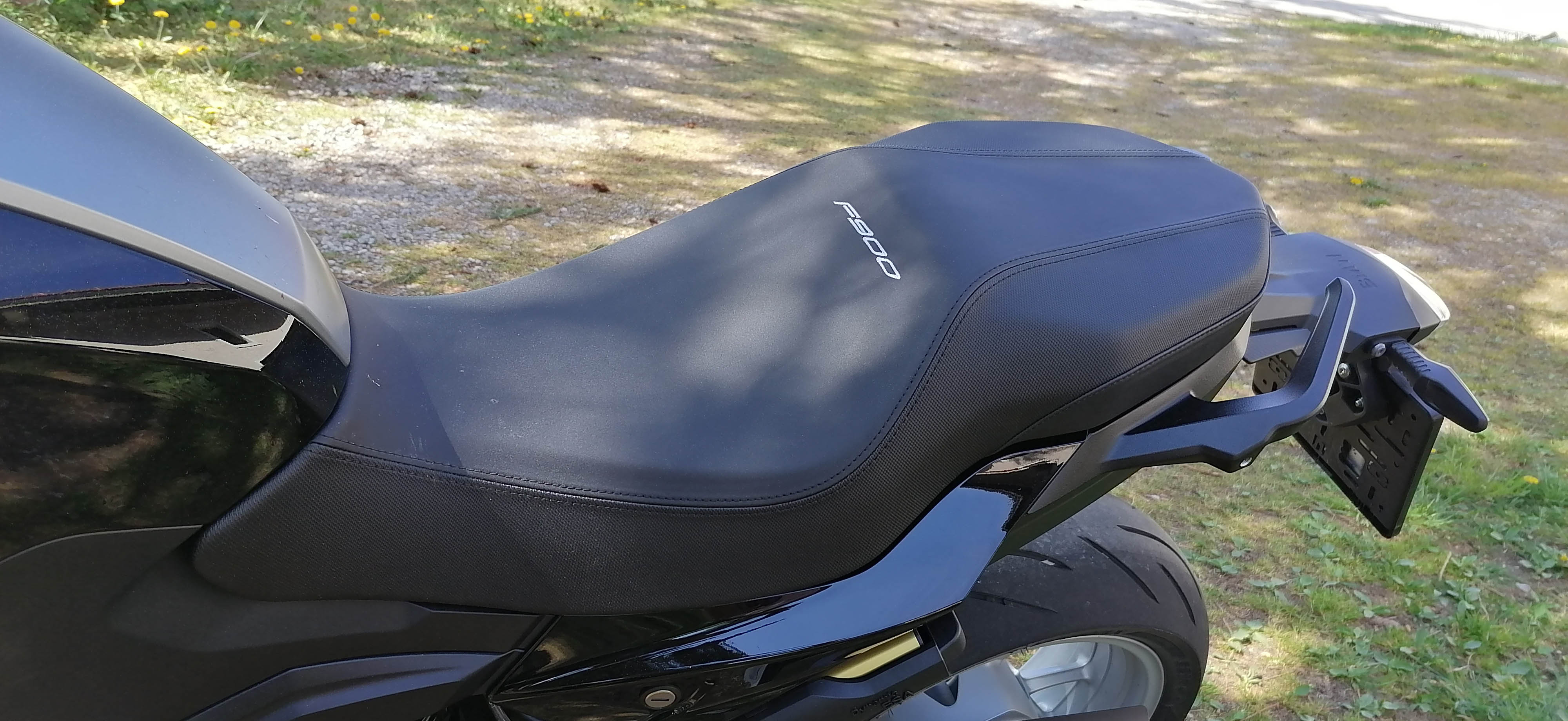 - bei der extra hohen Sitzbank ist der Fahrerbereich sogar höher (!) als der recht dünne Soziusbereich... Durch die Form der Nähte ist das optisch eine Art Extrakissen das da noch als Fremdkörper oben drauf gepflastert wurde? Optisch ein No-Go, ist mir bei der Präsentation einiger F900R Modelle auch schon aufgefallen.