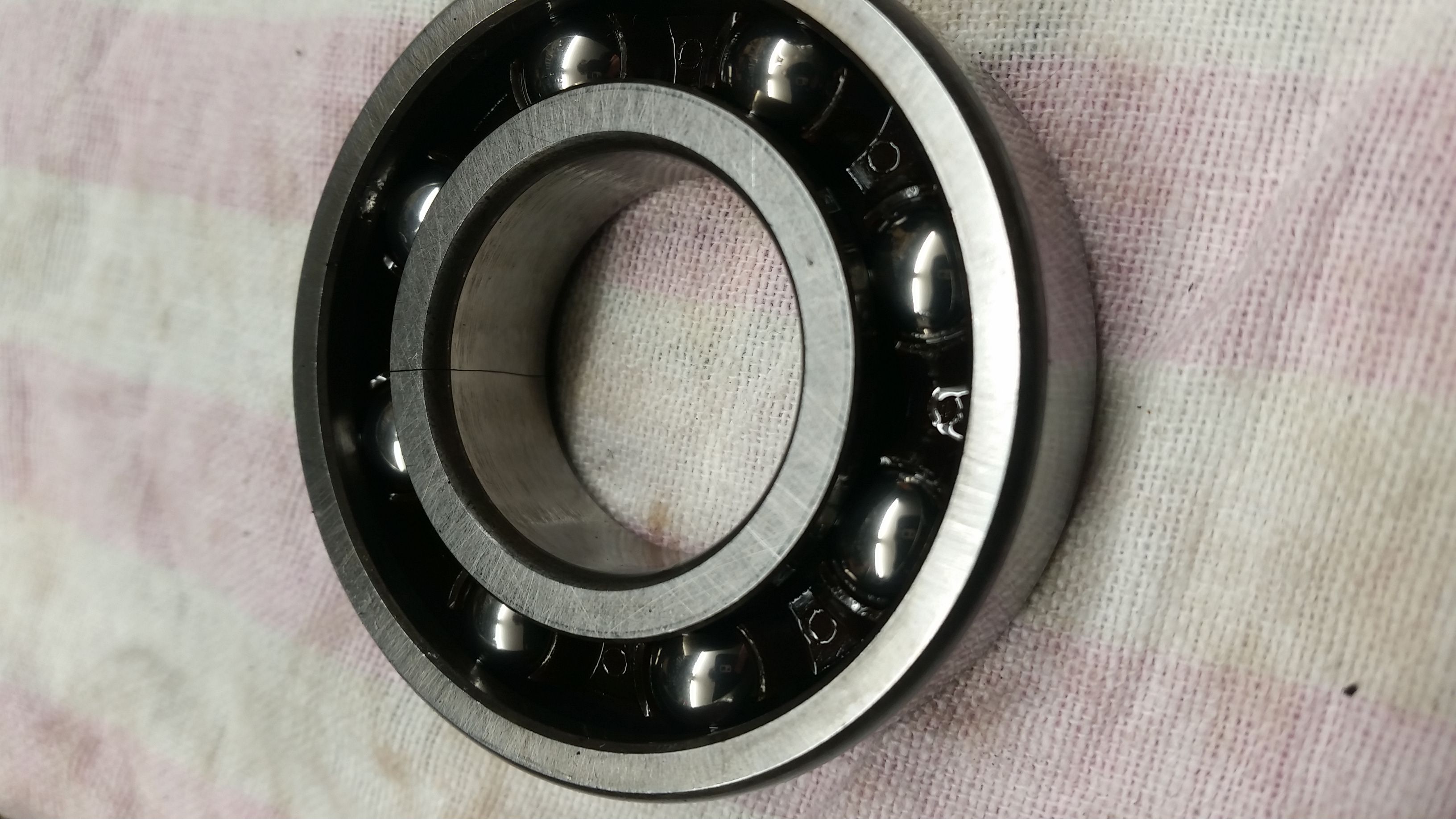 ich werde meinen Beitrag mal für dafür mißbrauchen...ab und zu mal etwas zur Motorrevision zu schreiben. Bei durchdrehen der Getriebewellen ist mir ein Geräusch aufgefallen...es hörte sich nach einem Fremdkörper in einem der Lager an. Das Geräusch ließ sich auf das Lager hinter dem Kupplungskorb einschränken. Nach der Demontage des Kugellagers zeigte sich, dass der Innenring komplett durchgerissen ist. Habe ich so noch nicht gesehen...aber seht selbst....