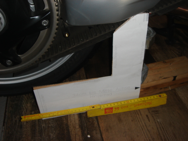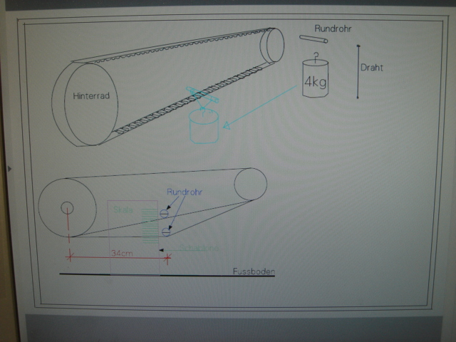 Zunächst wird nur die Haltestange am Messpunkt (34cm von der Hinterachse) auf den Riemen aufgelegt und der Wert auf der Schablone abgelesen.