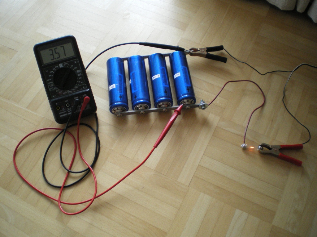 Habe sie alle 4 parallelgeschaltet (3,2V / 32Ah) und mit meinem 0815-Motorradbatterieladegerät (12V/1A) mit in Reihe geschaltetem 12V/10W-Glühbirnchen geladen.