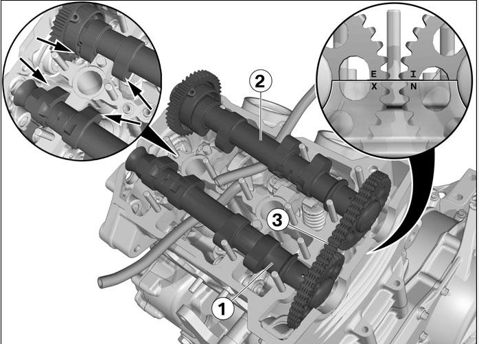 Auf Nockenstellung achten und Einlassnockenwelle (2) mit der Markierung I N am Nockenwellenrad plan zur Dichtfläche einbauen.