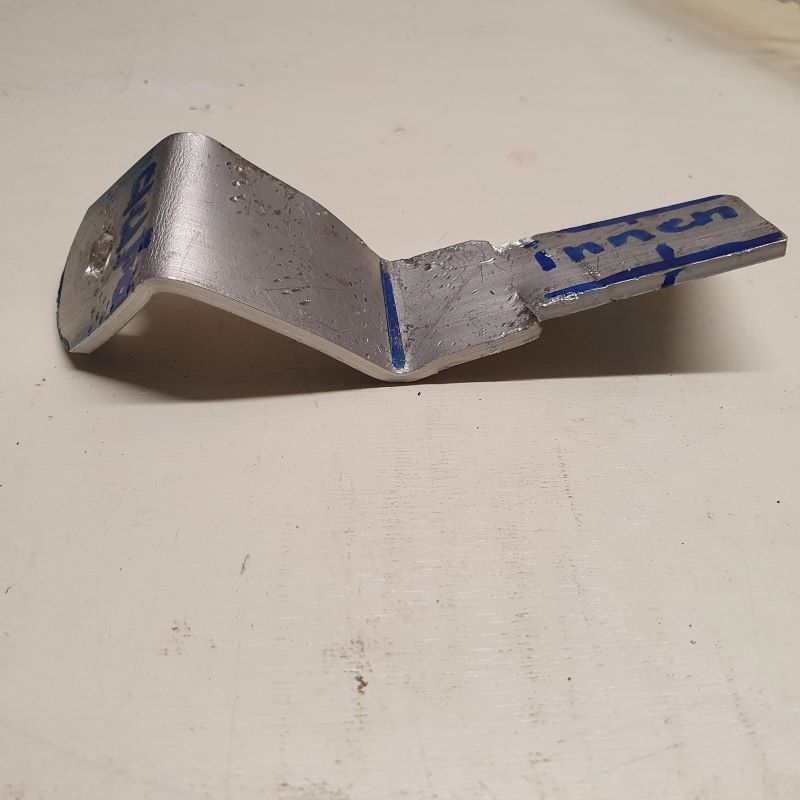 Das mit der Halterung, die das lose Ende des GT-Kofferhalters auffängt, war dann doch ein wenig kniffelig, da ich nur mit heimatlichen Bordmitteln und nicht mit Schlosser- oder Schweißer-Unterstützung arbeiten konnte. Eine Halterung von der vorhandenen Gewindebuchse im Heckrahmen zum Kofferhalter kann nur mit Schmiede- oder Schweißkunst erstellt werden. (Siehe das Foto meines Prototyp-Versuches aus Alu, der dem Erstellen eines gleichen Teils aus stabilem Flachstahl dienen sollte.)