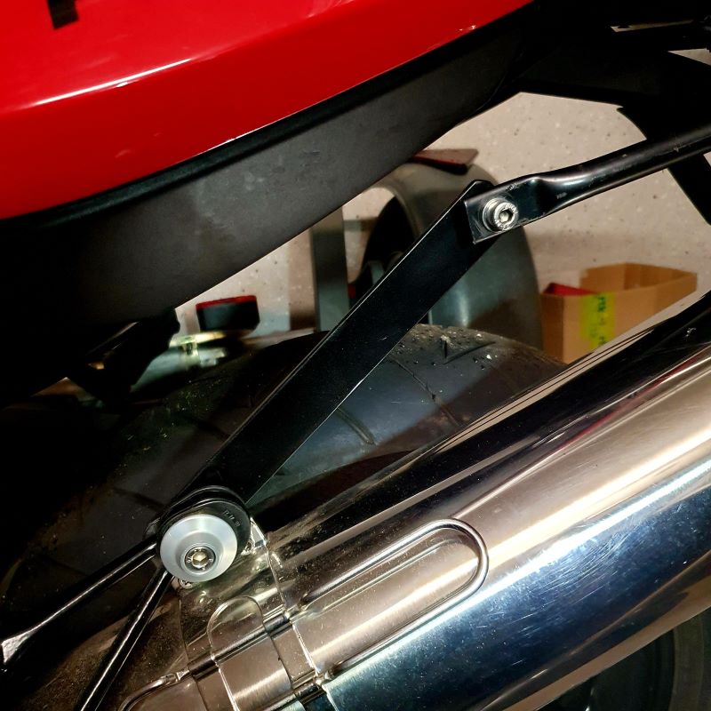 Das bedeutet, dass hier individuell eine Strebe oder Haltelasche zwischen Heckrahmen oder Auspuffhalter (am Fußrastenhalter) und dem losen Ende des Kofferhalters gebastelt werden muss. Der Versuch startet, sobald der bestellte Kofferhalter bei mir eintrifft...