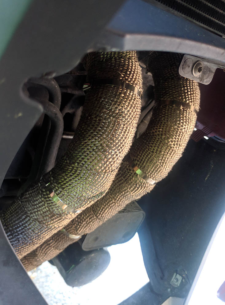 Aus dem USA 800 GT Forum habe ich den Tipp mit dem umwickeln der Auspuffrohre. Der Ölkühler und die Ein/Auslass Schläuche vom Wasserkühler sind dadurch besser isoliert von der Hitzeabstrahlung der Auspuffrohre.
