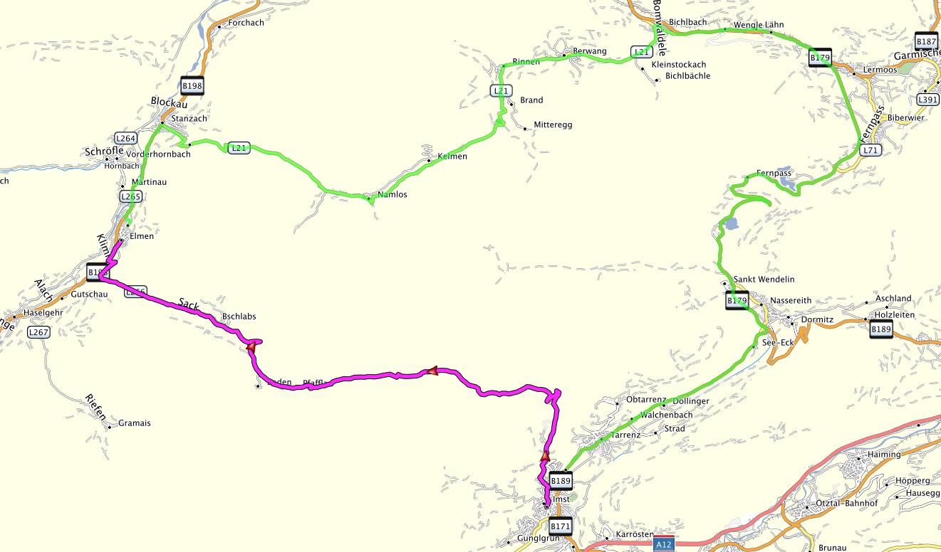 Und komisch ist ja auch, dass das Navi diese Hahntennjochstrecke von Elmen nach Imst akzeptiert, aber nicht von Imst nach Elmen.